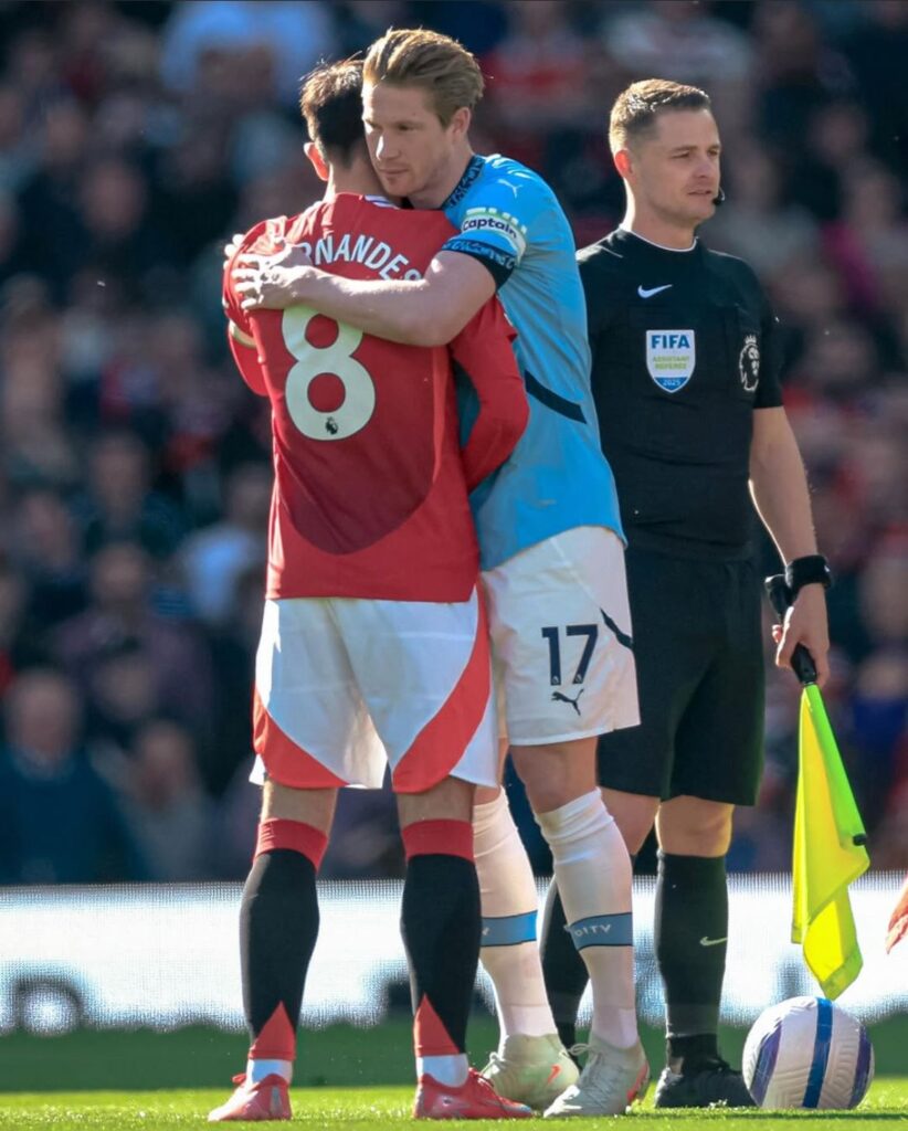 Bruno Fernandes and Kevin De Bruyne hugging before kick off.